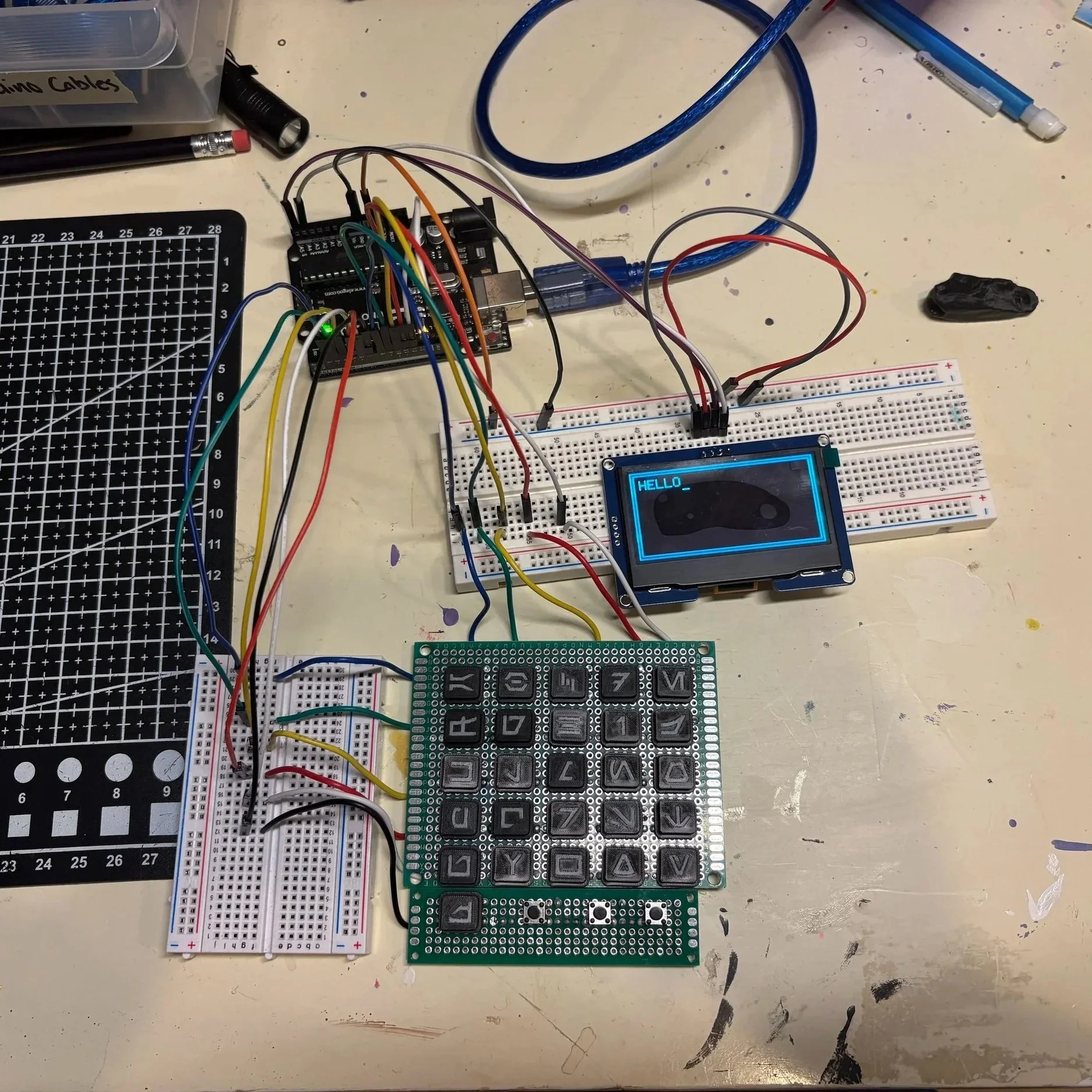 Designed a handheld Aurebesh-to-English input device with custom keycaps and a button matrix. Enclosure currently in progress.