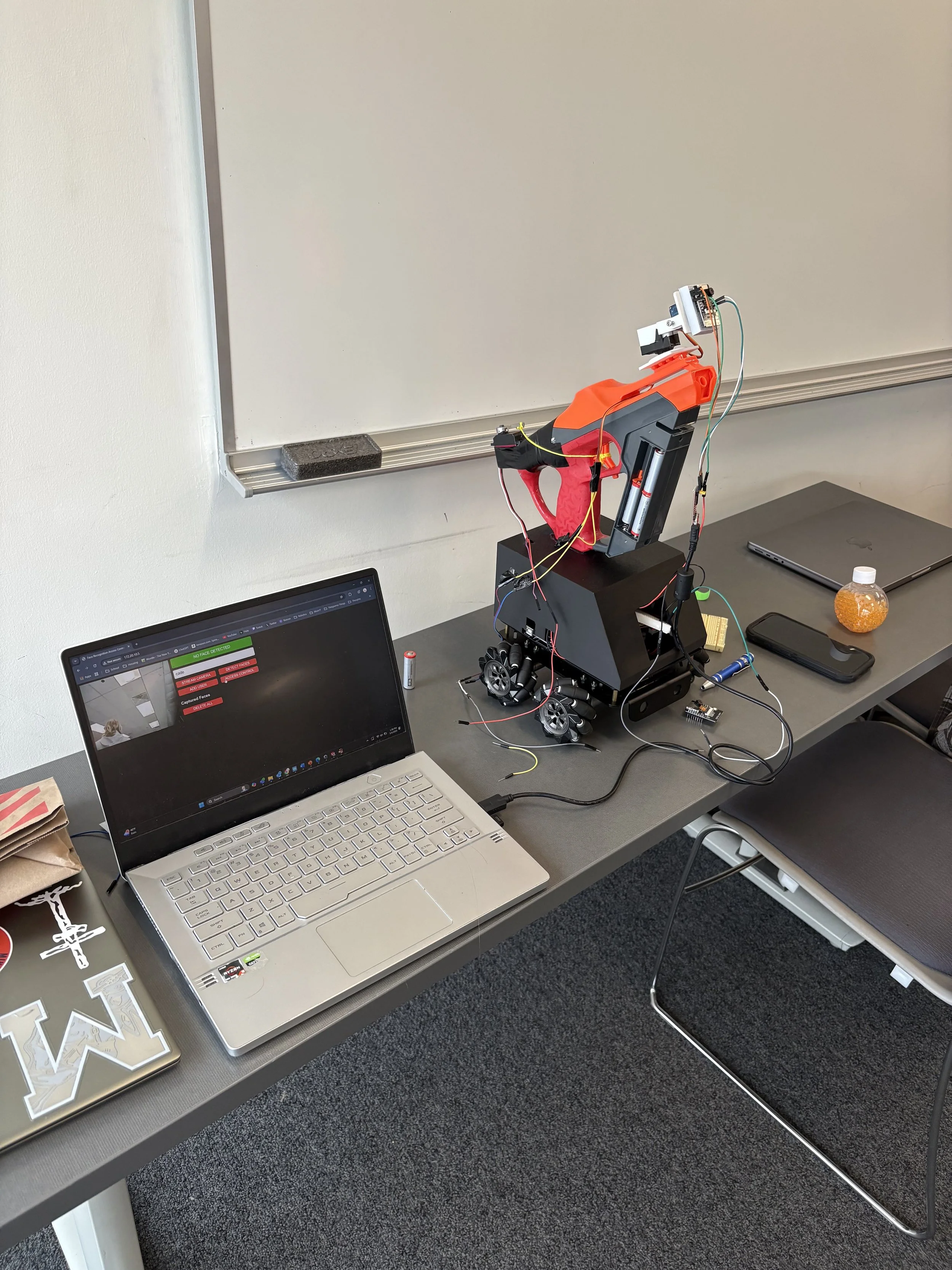 Built a motorized face-tracking turret using an ESP32-CAM with real time facial recognition to make shoot/no-shoot decisions.