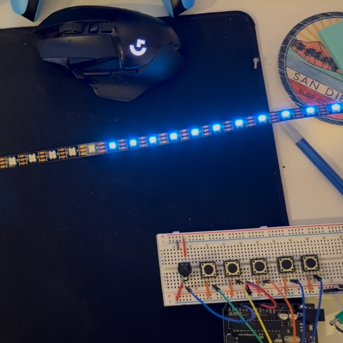 Photo displaying board and strip from test, currently displayed is number of pixels lit controlled by potentiometer